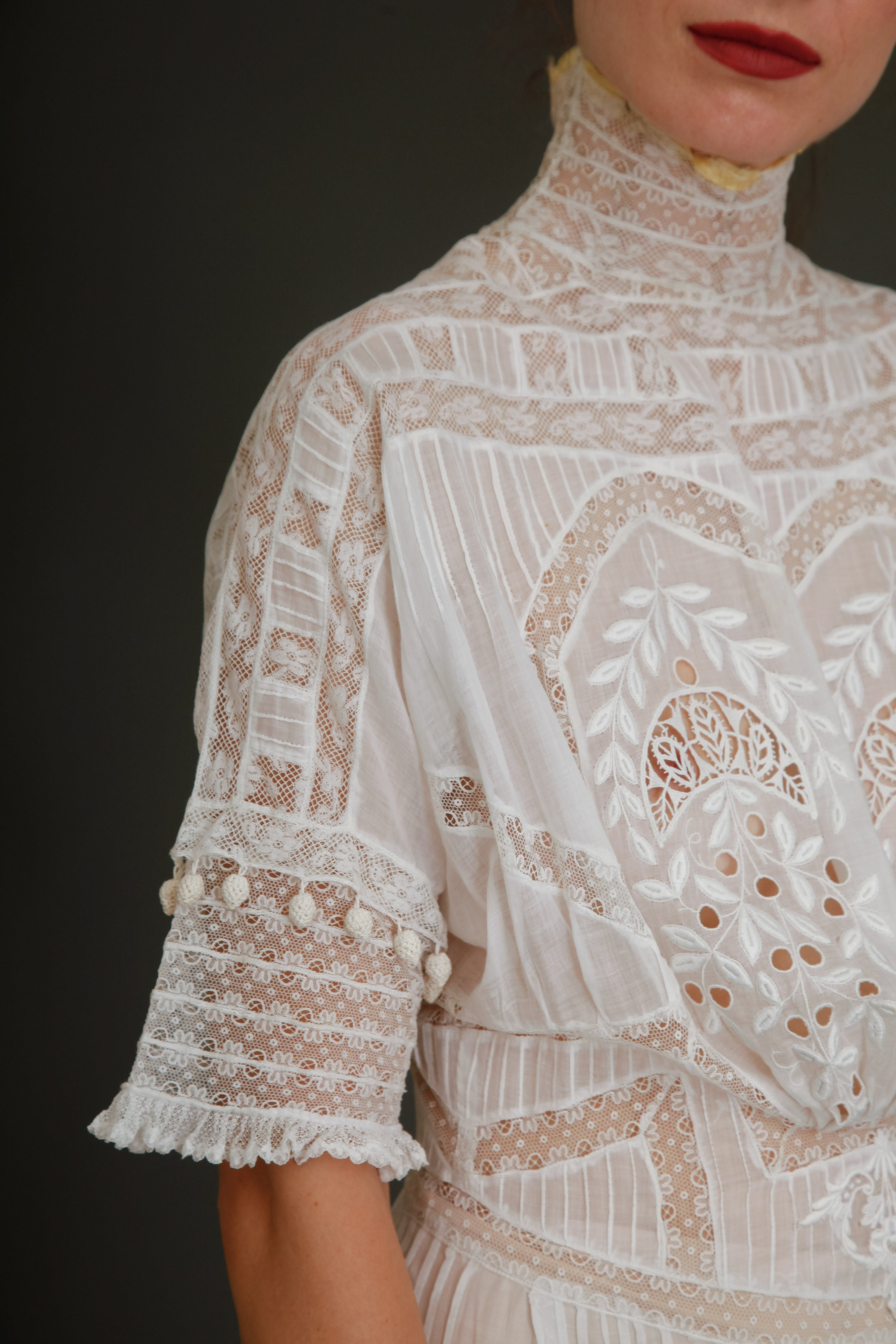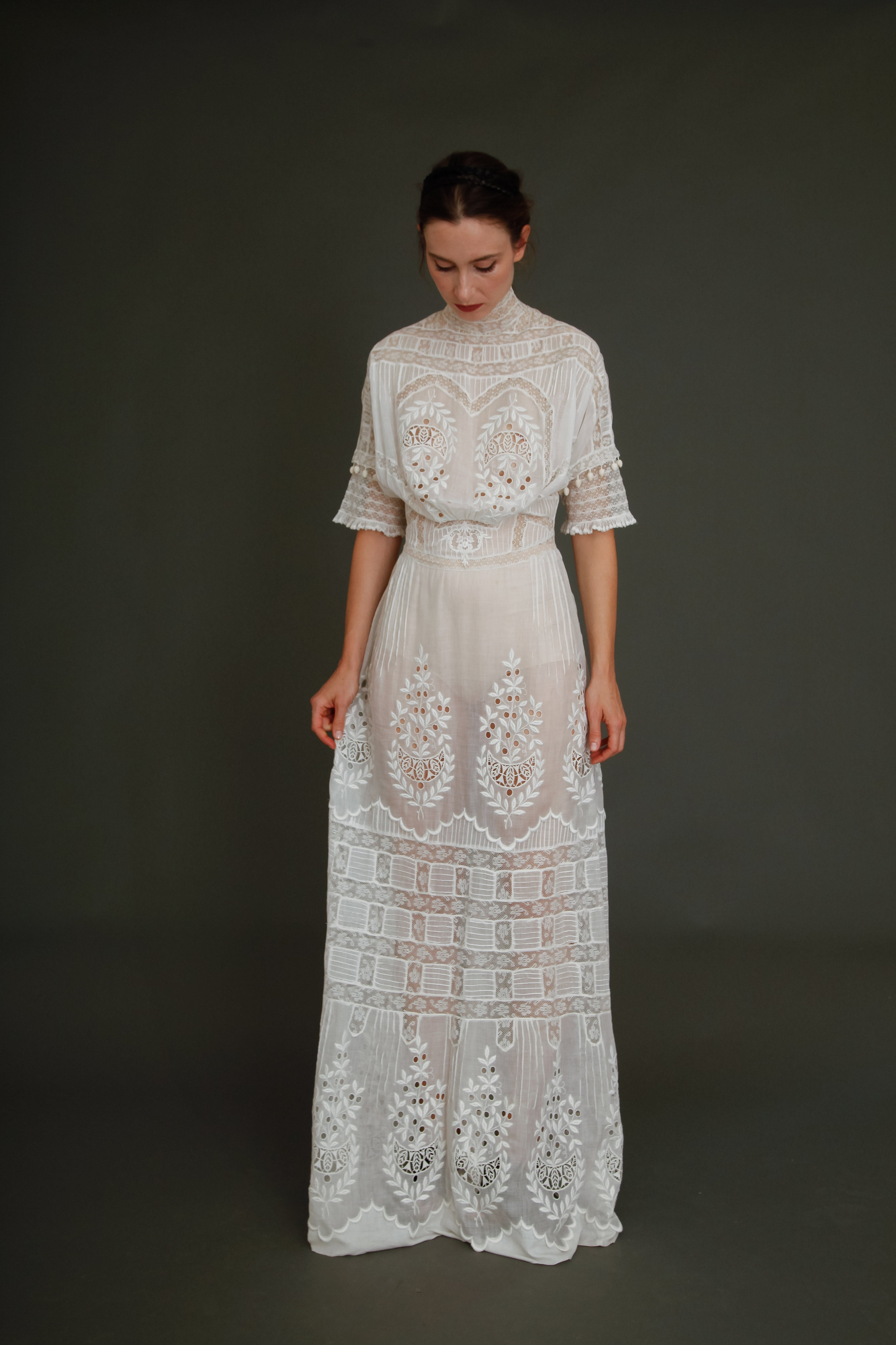 1910 Edwardian Long Lawn Dress with Floral Embroidery -