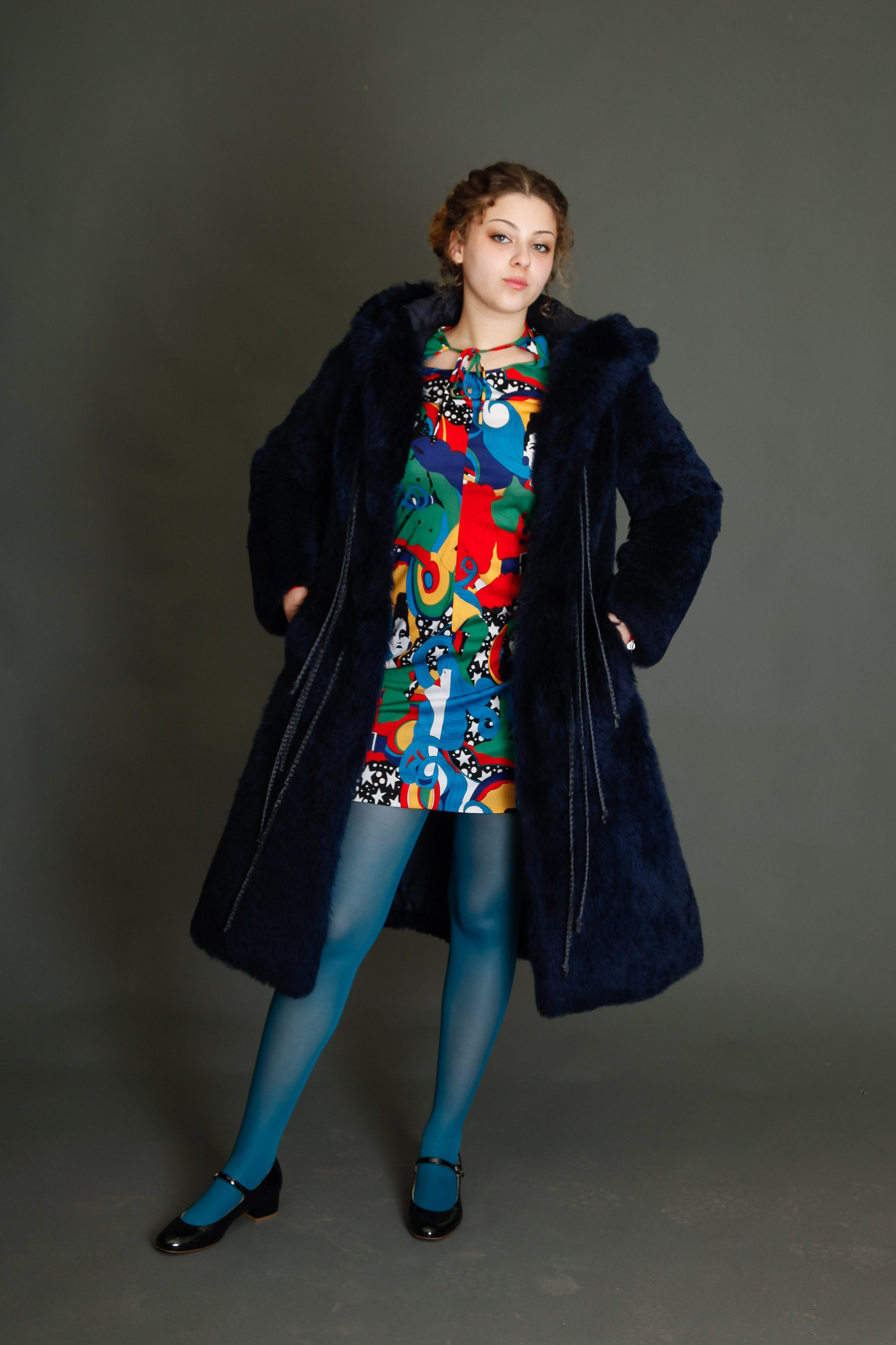 70s Blue Hooded Shearling Fur -