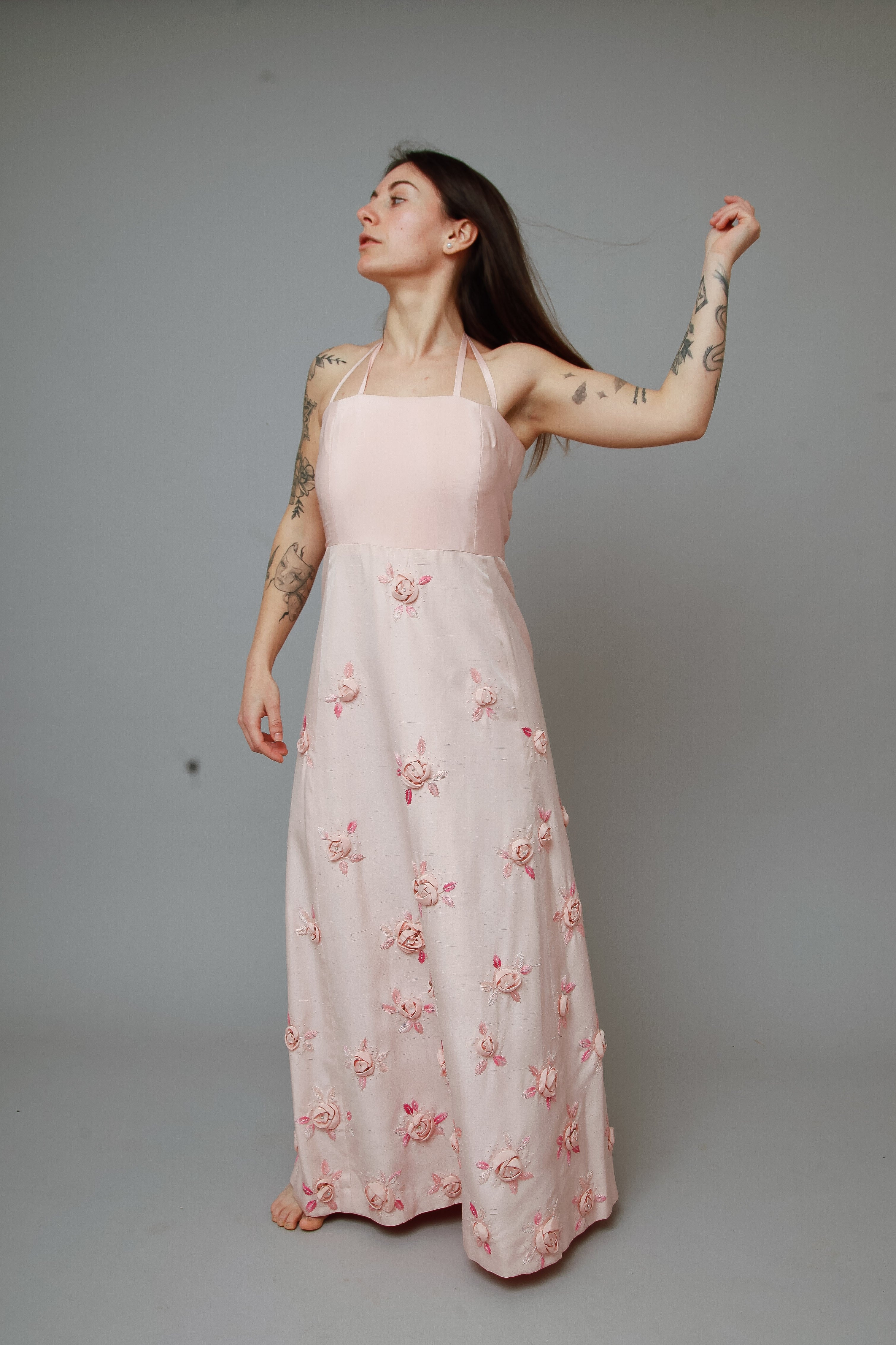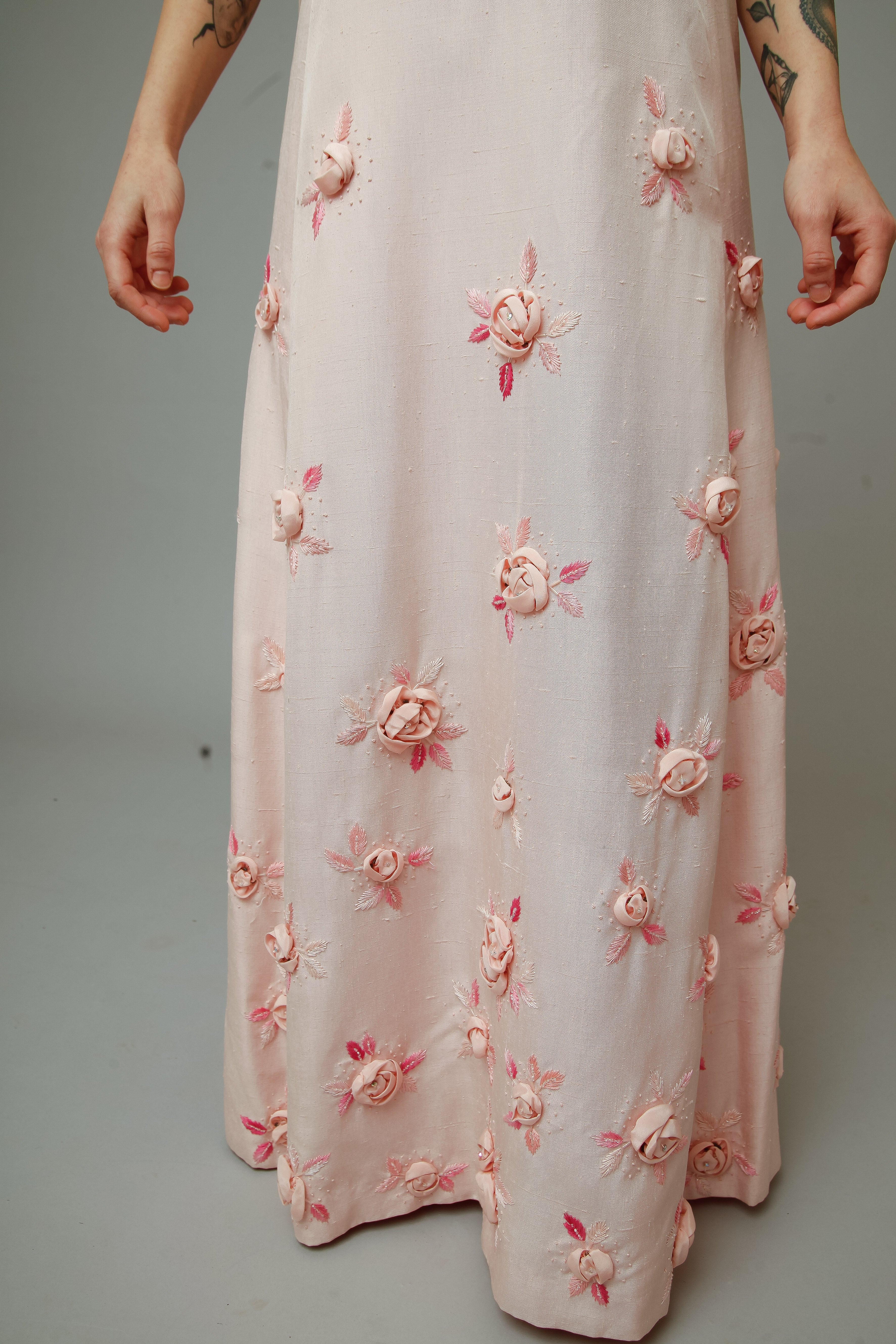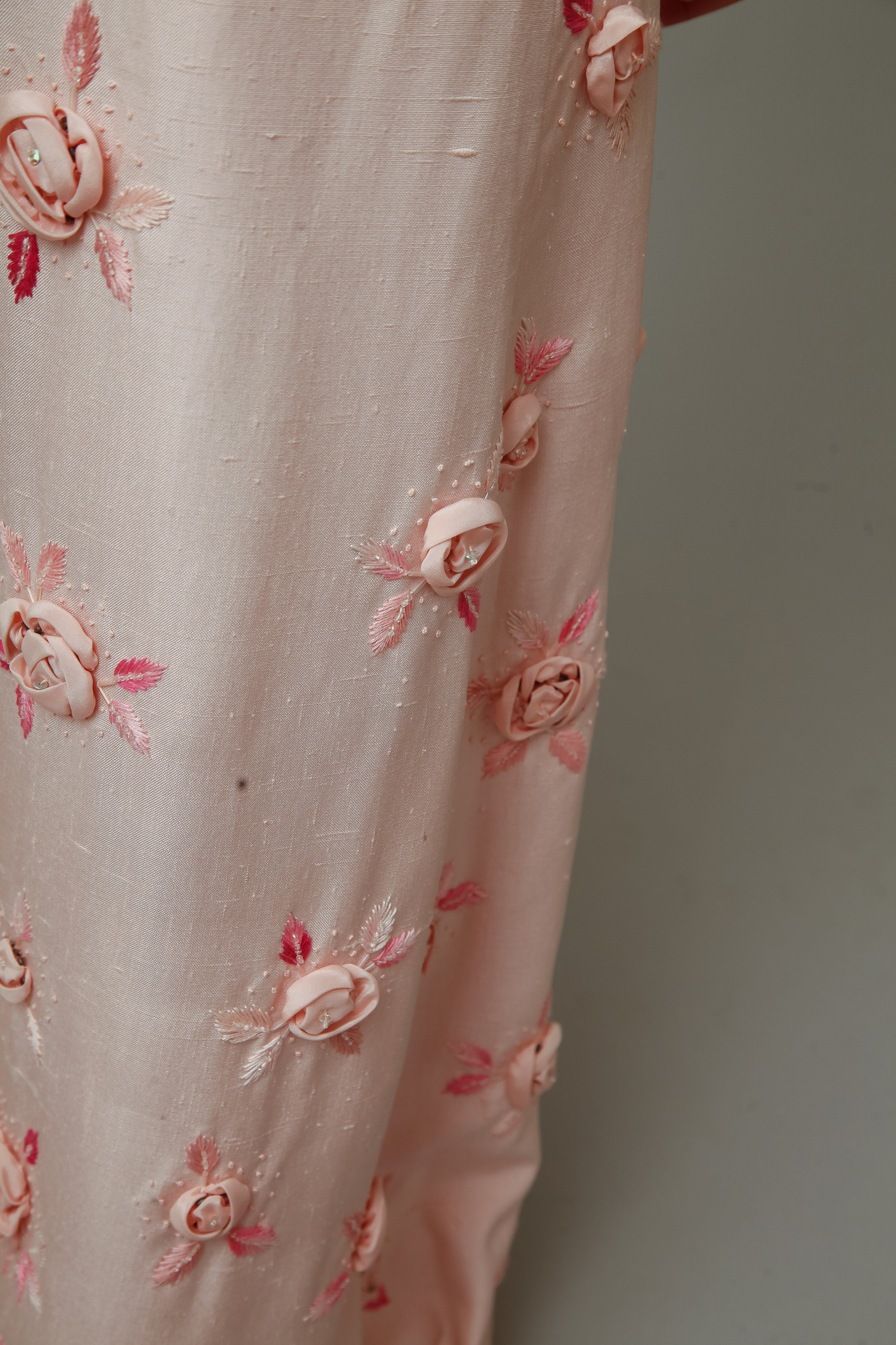 Piccolo capolavoro di sartoria italiana questo lungo abito in seta rosa della seconda meta' degli anni 60. Corpetto in seta con taglio impero e lunghi nastri da annodare dietro la nuca.