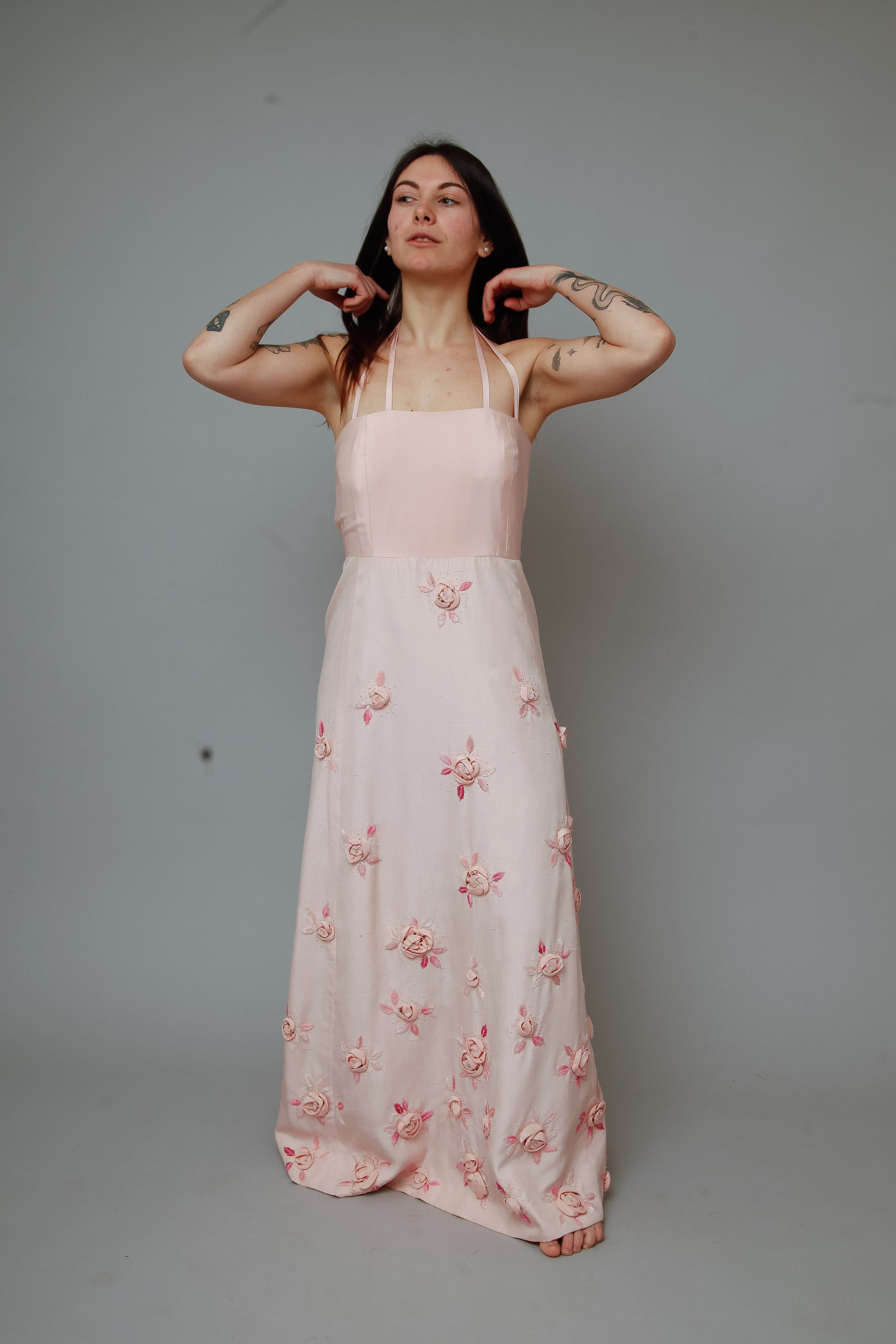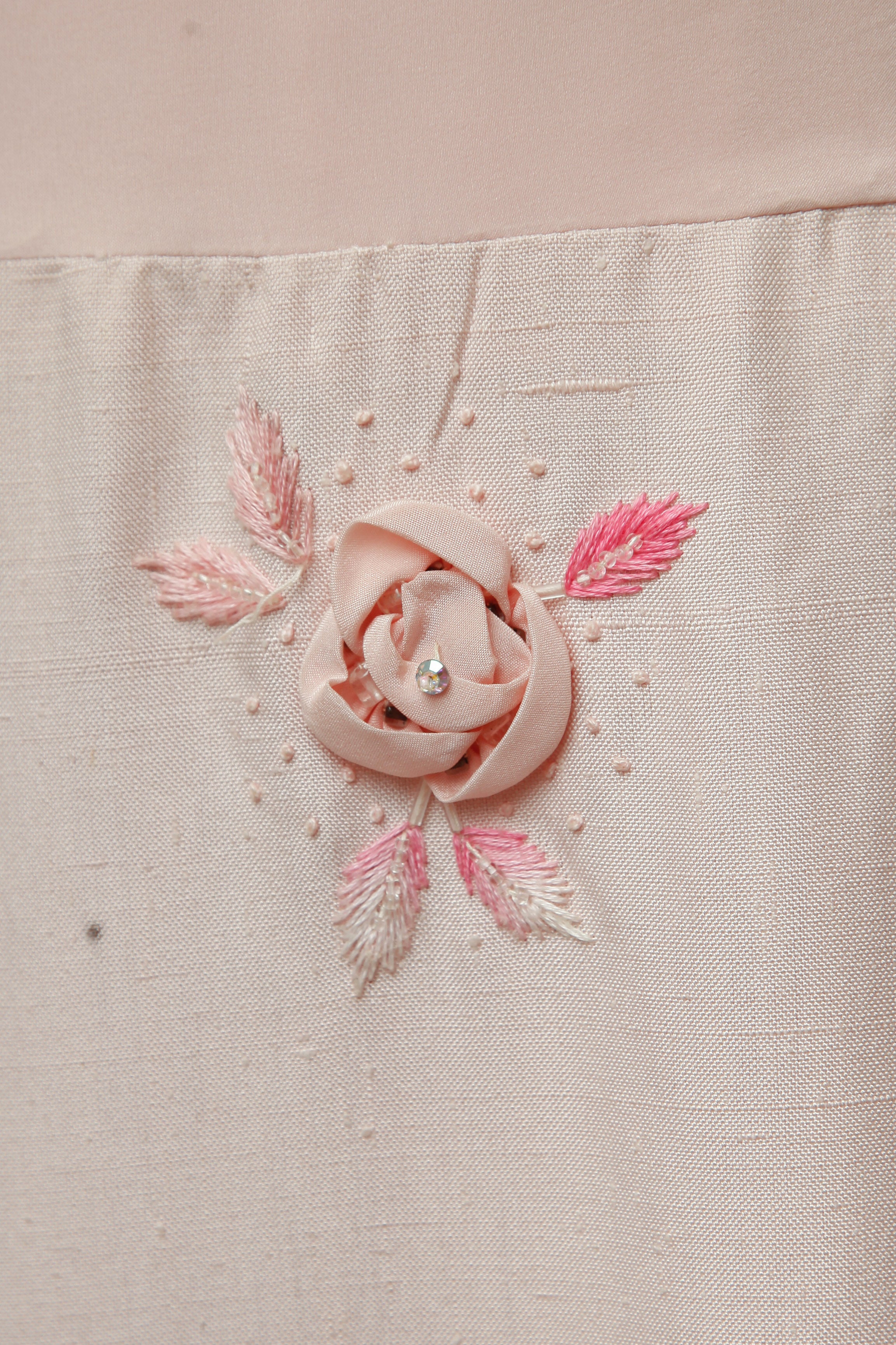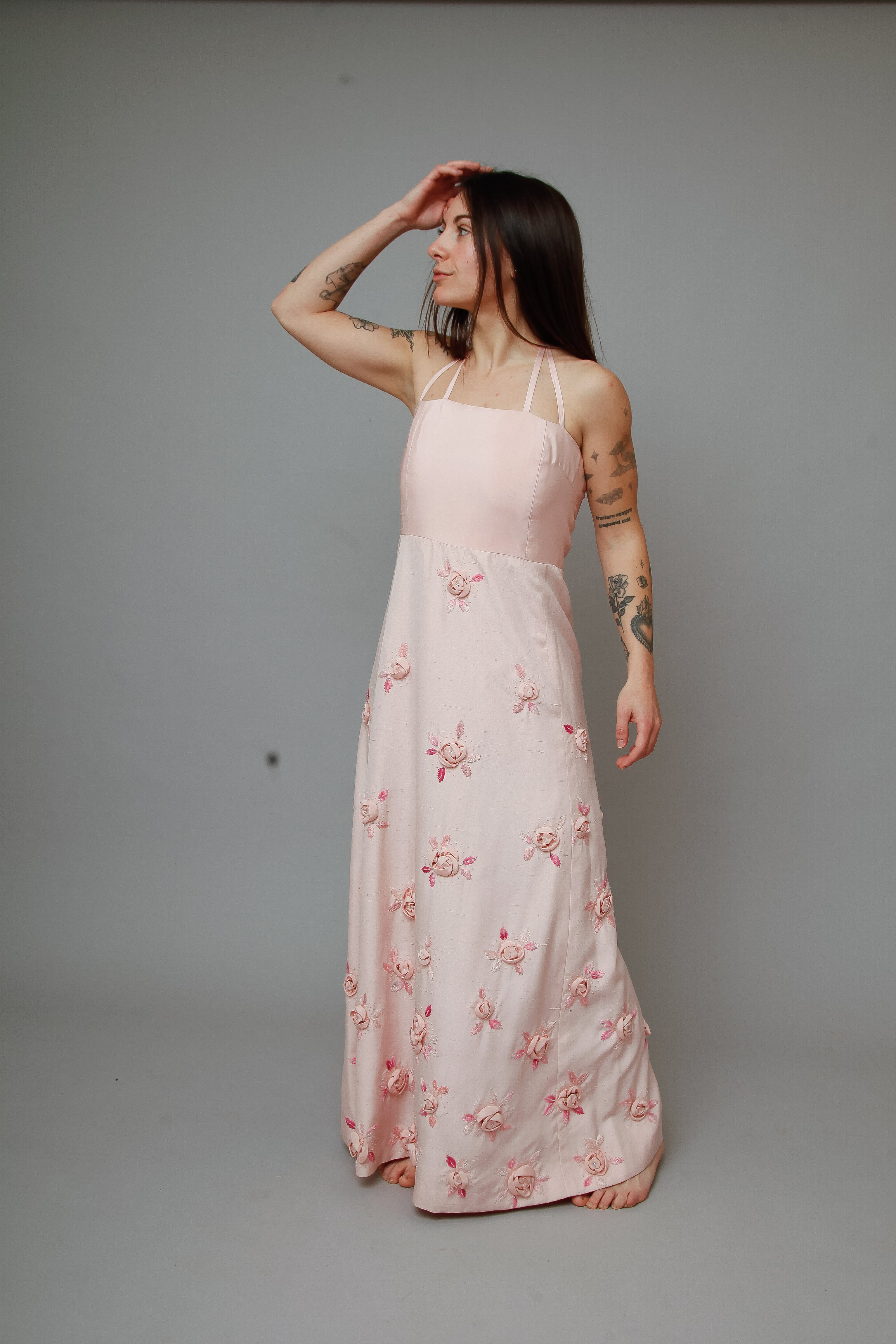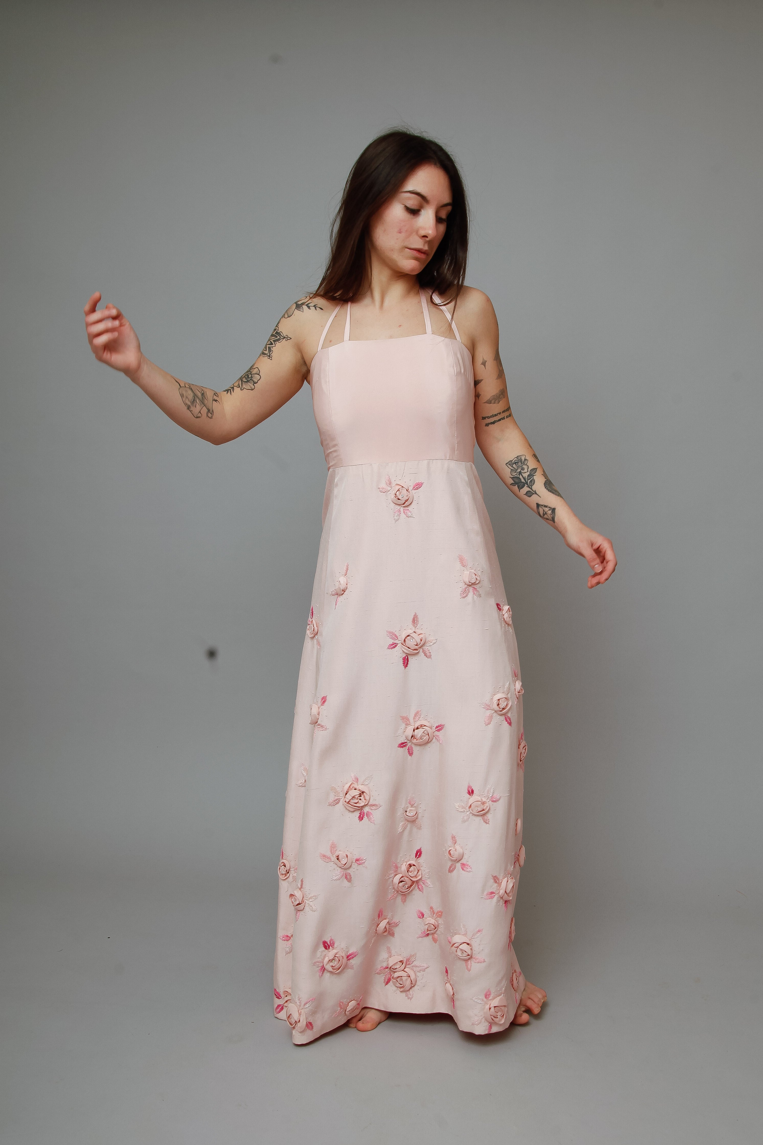 Piccolo capolavoro di sartoria italiana questo lungo abito in seta rosa della seconda meta' degli anni 60. Corpetto in seta con taglio impero e lunghi nastri da annodare dietro la nuca.