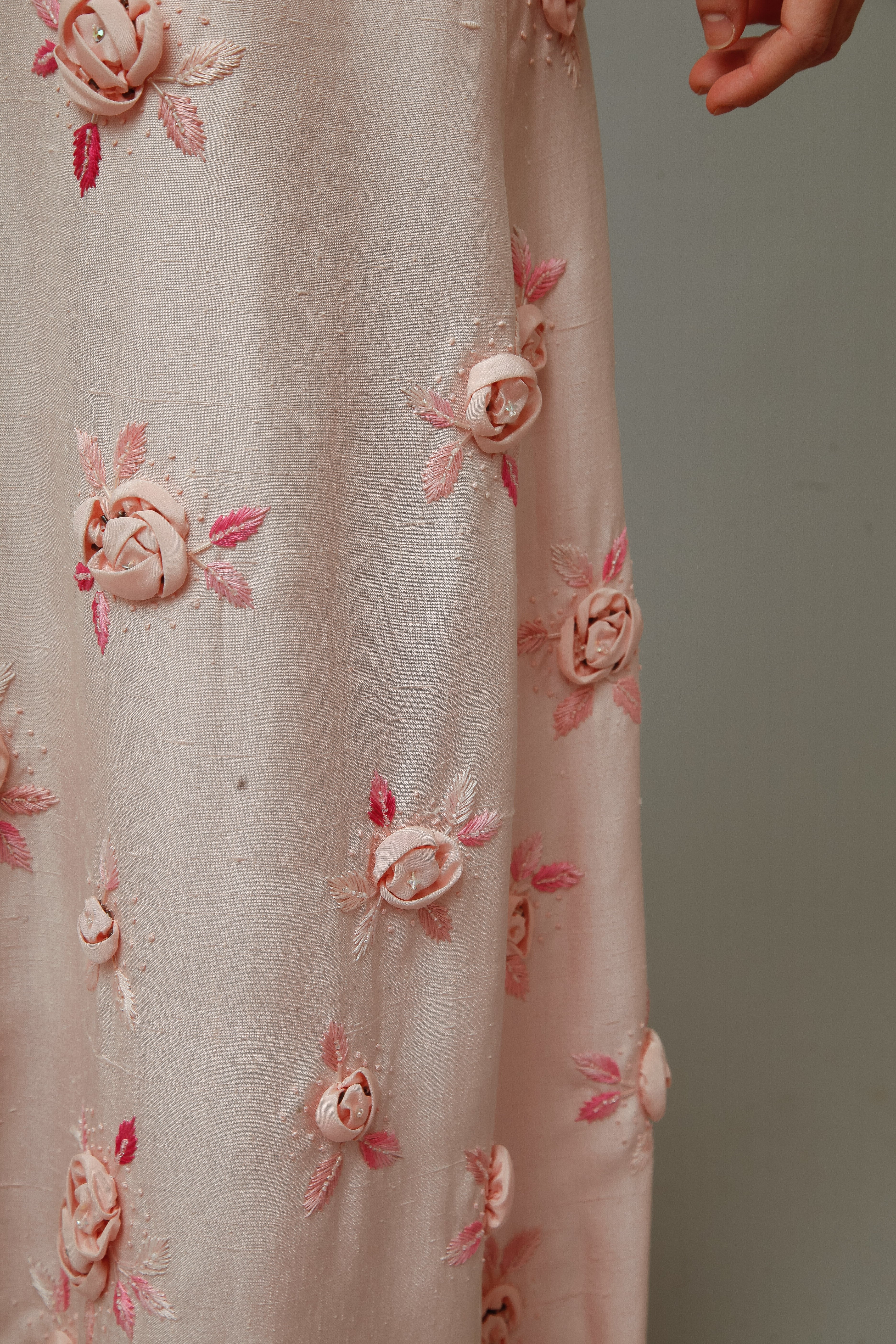 Lunga gonna in delicato shantung di seta dalla linea leggermente svasata sulla quale sono applicate delicate rose confezionate in seta con foglie ricamate. L'abito e' foderato e si chiude su un fianco con una zip in metallo ed un gancetto. Fit a size XS/S