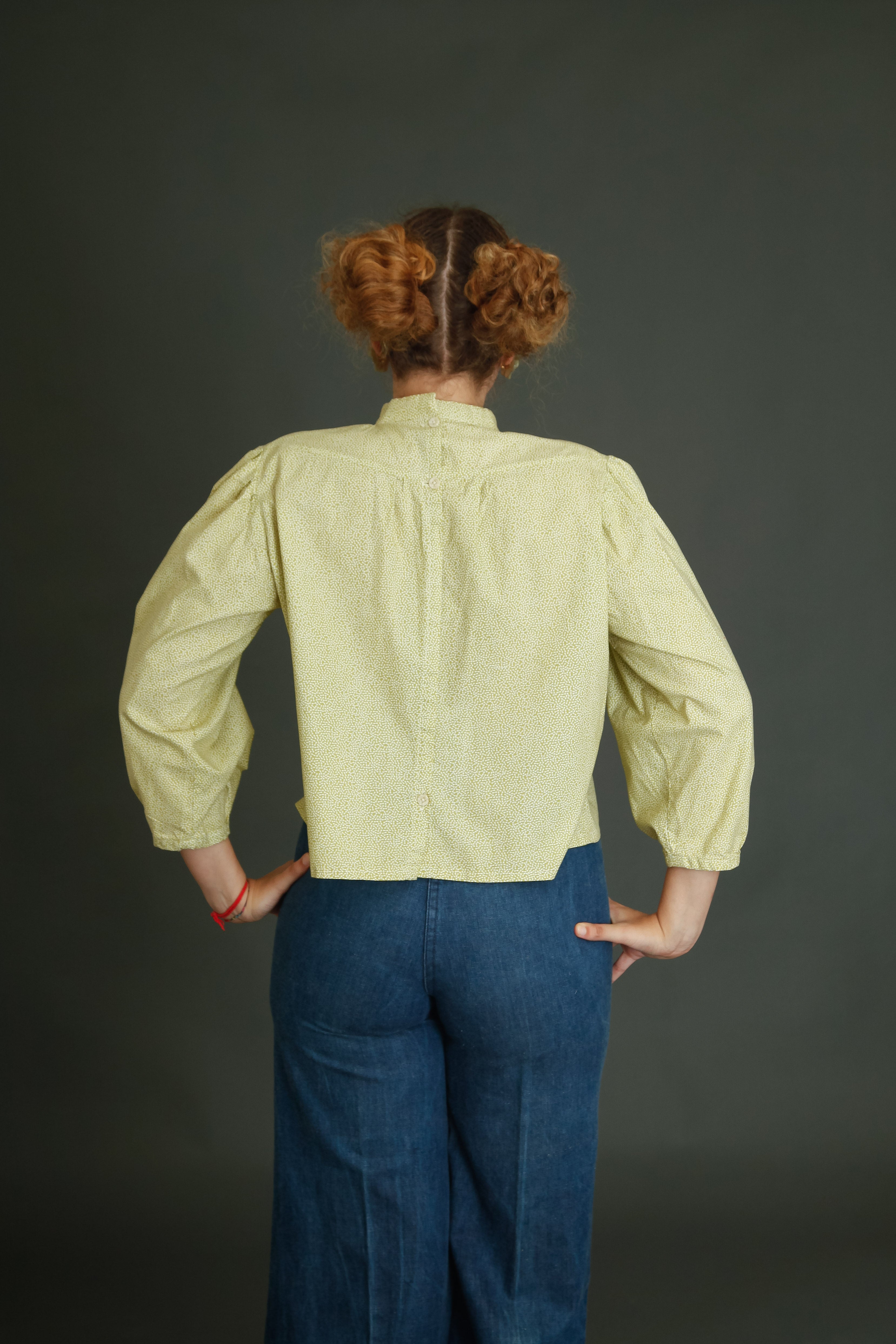 Ha collo a listino e plastron stondato dal quale parte una sottile arricciatura che da volume alla blusa. Le maniche sono 3/4 e si chiudono con un minuscolo polsino chiuso con un bottone. Si allaccia sulla schiena con bottoni in madreperla. Fit a size S