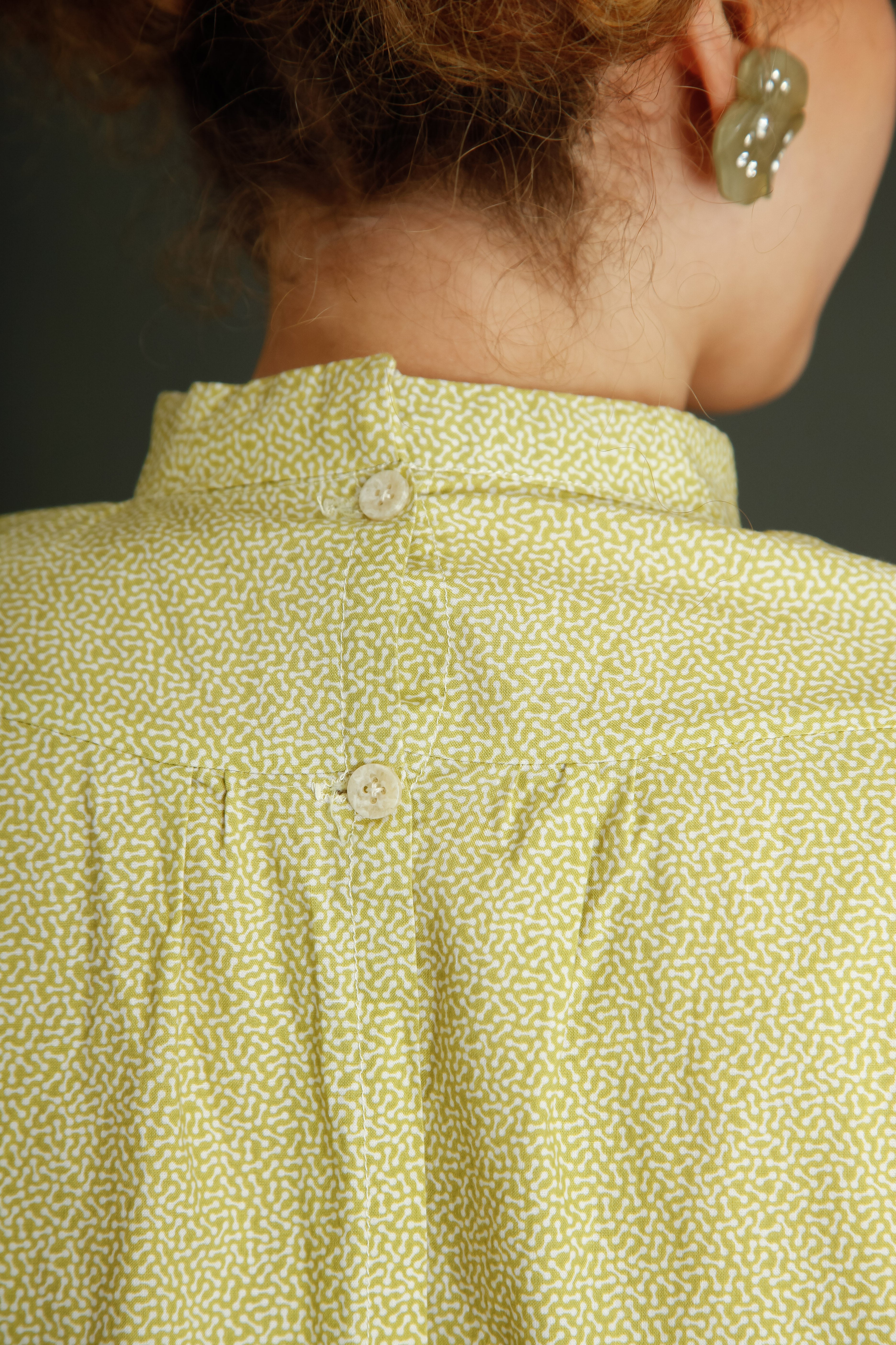 Confezionato in corposo tessuto di cotone verde con una minuscola fantasia astratta bianca.