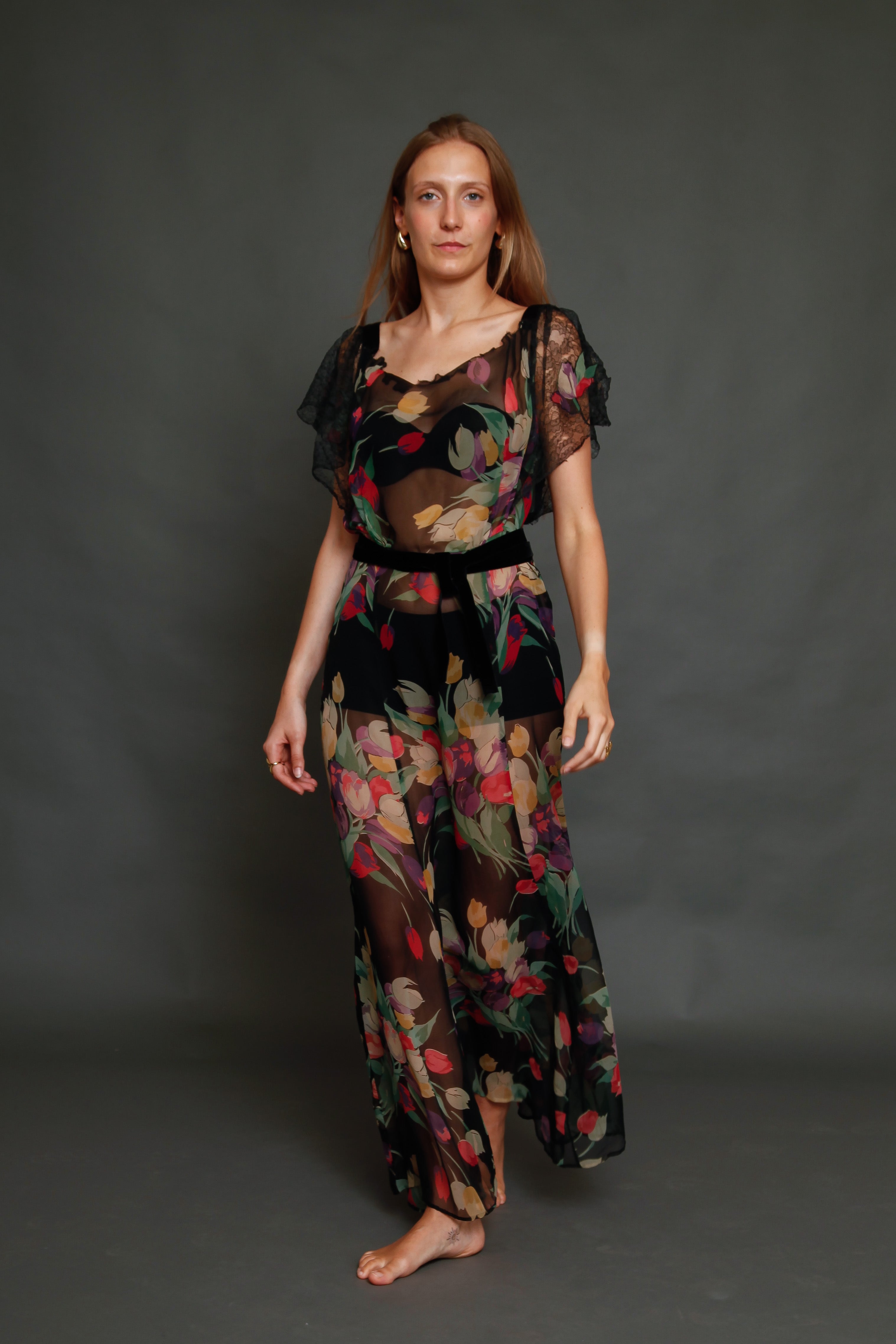 Abito anni 30 confezionato in delicato chiffon di seta con una stupenda fantasia di tulipani.