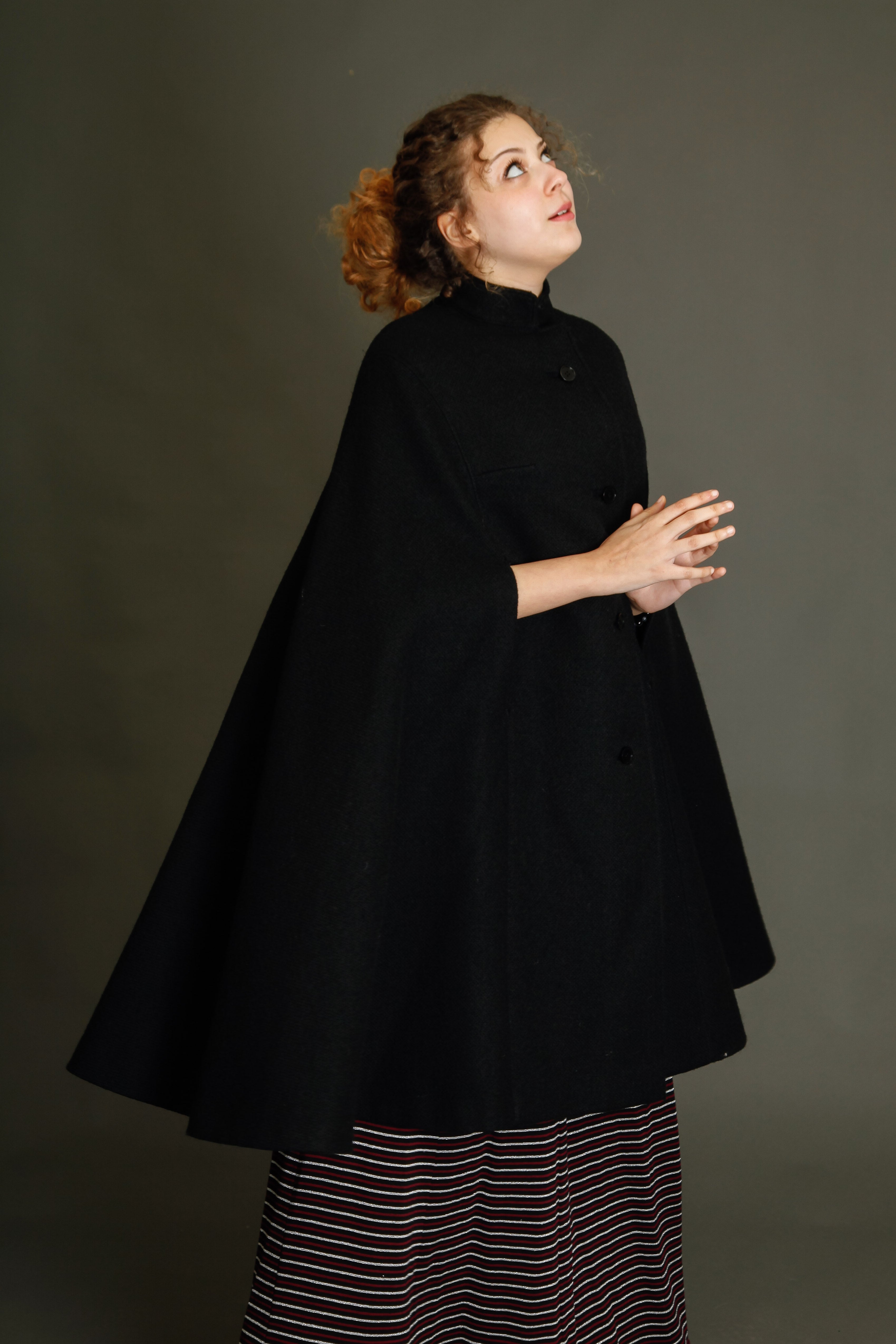 Bellissima mantella in lana dal taglio rigoroso, di manifattura sartoriale. Le spalle sono ben delineate ed aderenti e lo sprone anziche' lineare ha un taglio a zig zag che dona volume alla parte inferiore della mantella. Collo a listino ed ampi  inviti per le mani con piccolo tassello di rinforzo ricamato a mano sulle estremita'. La mantella e' confezionata in pesante e caldissimo tessuto di lana con una mano leggermente ruvida ed e' foderata. Fit  a size S