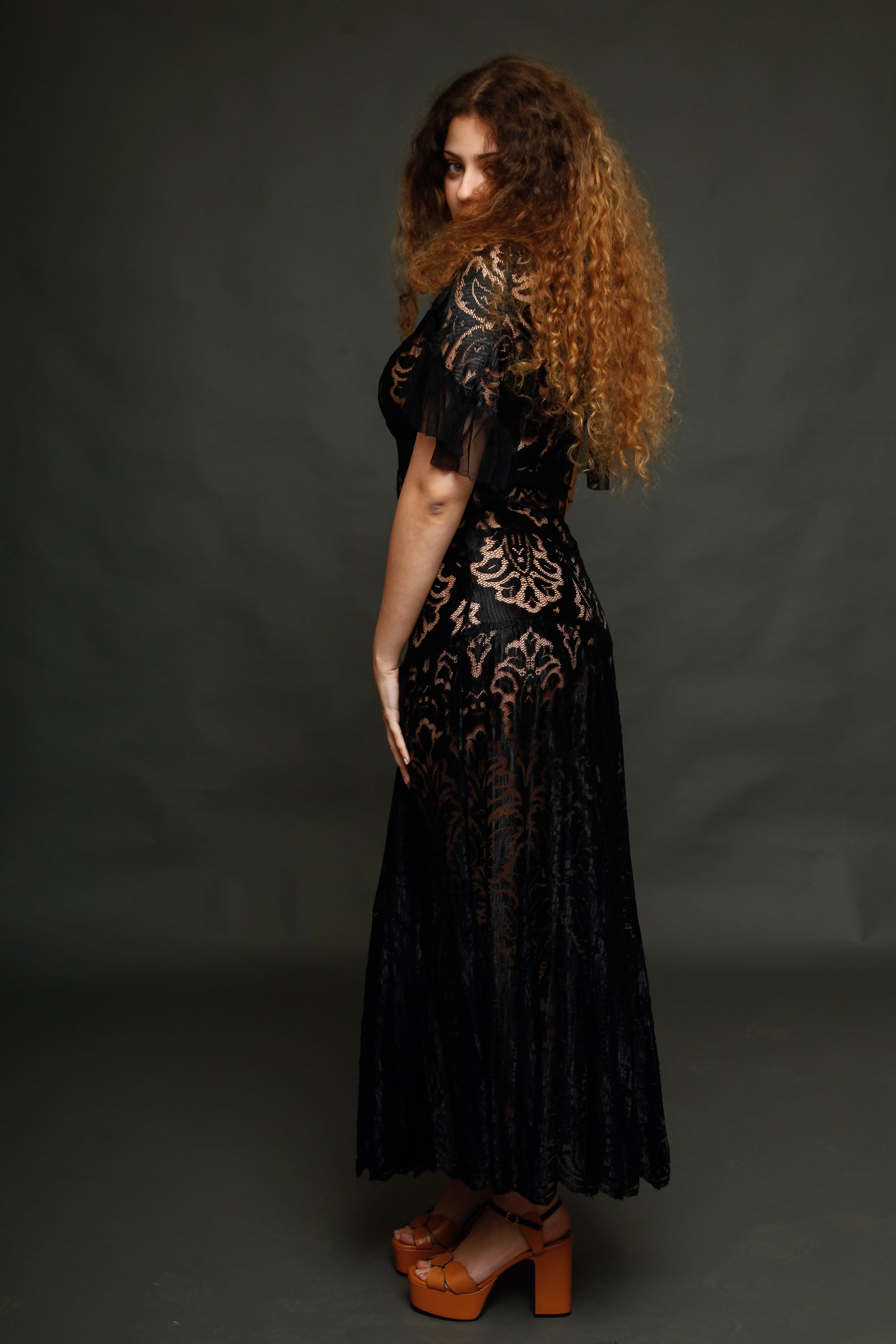 Abito anni 30 confezionato in delicato e prezioso pizzo di seta. Corpetto avvitato e gonna leggermente svasata, Le maniche sono a mantella con bordatura in tulle. Scollatura a V leggermente sormontata sulla schiena e rifinita da una applicazione in tulle. Si chiude sul fianco con piccoli bottoni a pressione ed un gancetto. Vicino alla chiusura è presente un rammendo invisibile ( è effettivamente invisibile). Abito indossabile ma con cautela in quanto il pizzo di seta e' per sua natura delicato. Fit a size S
